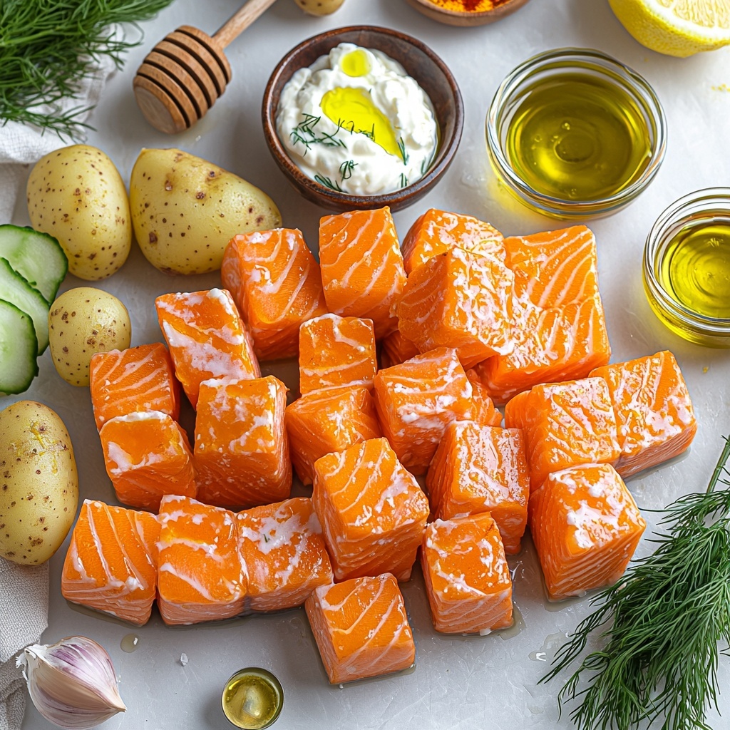 - Marinate the salmon bites: While potatoes cook, cut the salmon fillet into 1.5-inch cubes. In a bowl, toss the salmon cubes with Dijon mustard, honey, lemon juice, and dill to coat them thoroughly and infuse flavor.