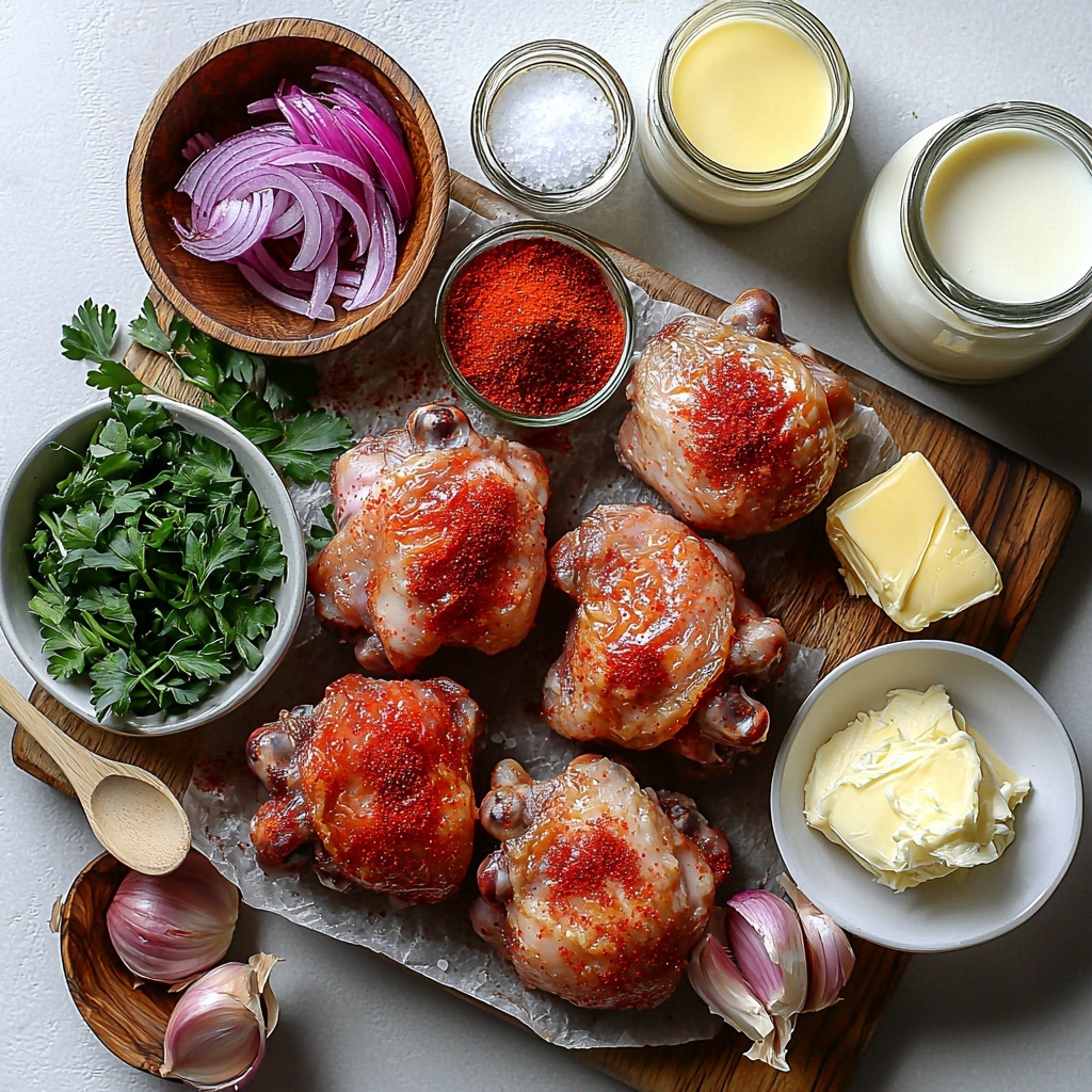 Start by preheating your oven to 375°F (190°C). While it warms up, trim any excess fat off your dark meat chicken pieces to ensure even cooking. Then, generously season the chicken with kosher salt, smoked paprika, and Montreal chicken seasoning. These simple steps lay the foundation for flavors that will make the final dish unforgettable.