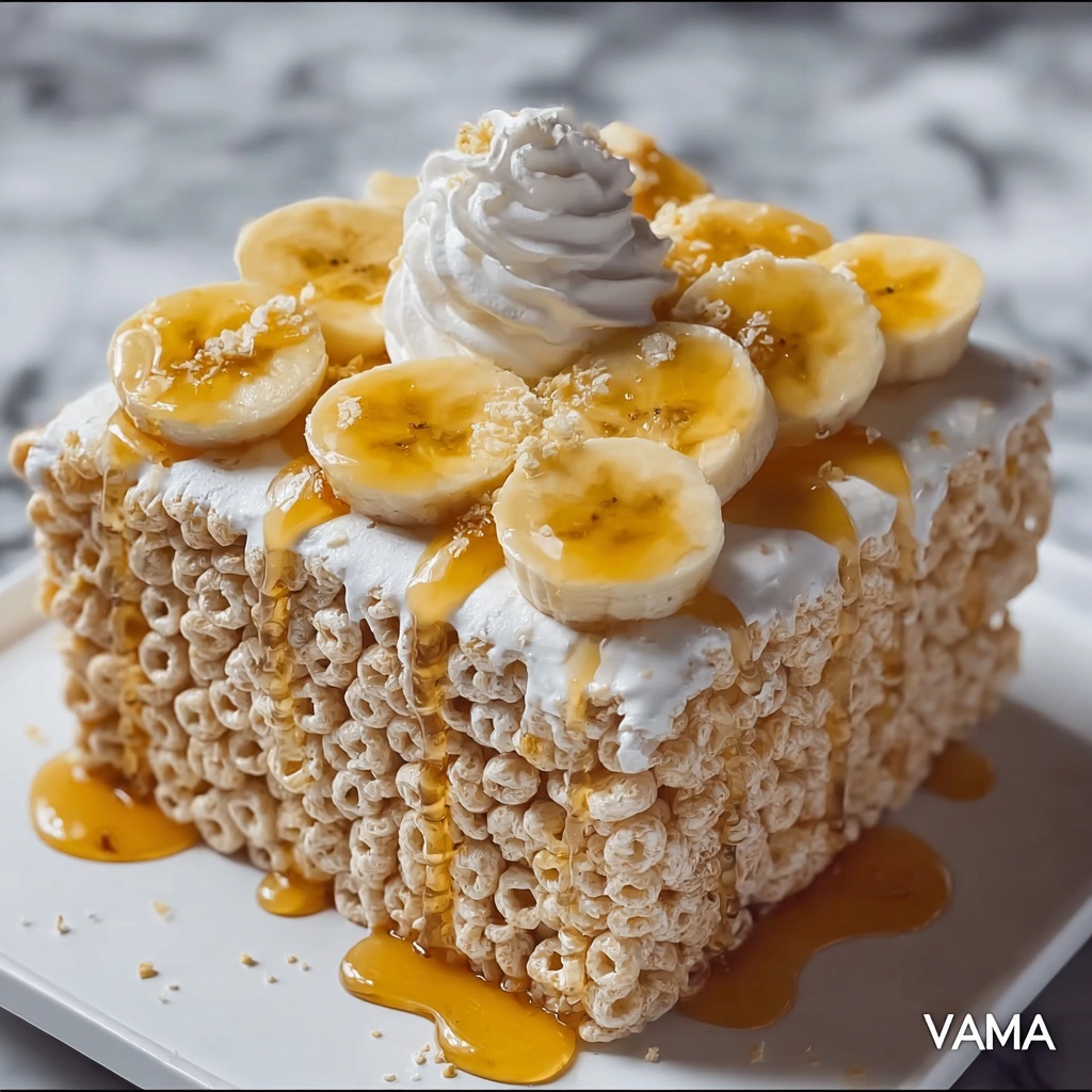 Just before serving, drizzle honey over the top to bring an extra touch of sweetness and that beautiful sticky gloss. This final flourish not only looks inviting but also complements all the flavors in the Banana Pudding Rice Krispies Recipe with its natural floral notes.