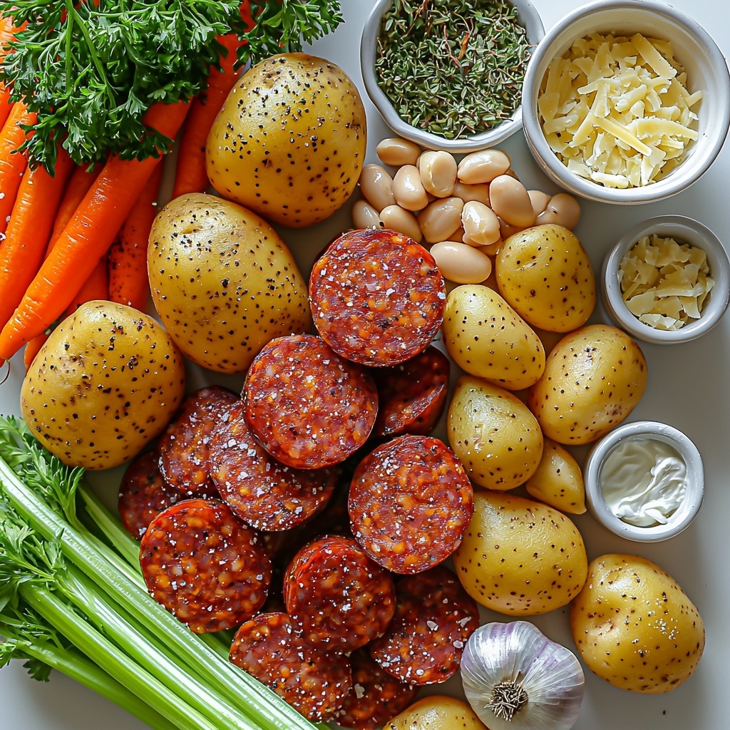 The beauty of this recipe lies in its straightforward ingredients. Each one brings an essential element that builds the perfect texture, taste, and aroma — from the smoky kick of kielbasa to the creamy silkiness of Yukon Gold potatoes and the freshness of hearty herbs.