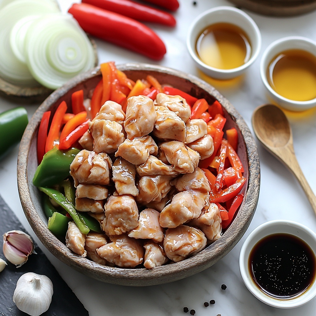 In the same pan, add a little more oil if needed and toss in the minced garlic, sliced onions, and bell peppers. Stir-fry these for 3 to 4 minutes until the vegetables are tender yet still retain a pleasant crispness. This contrast sets a lively texture that pairs perfectly with the succulent chicken.