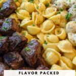 - Combine and Serve: Arrange the seared steak bites over the cheesy garlic shells and sprinkle with chopped fresh parsley for garnish. Serve immediately while hot and enjoy.