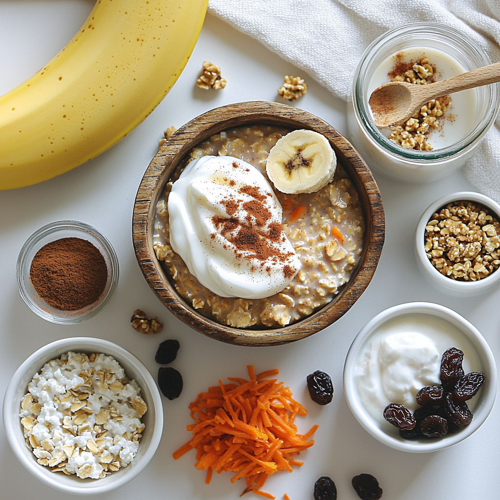 - Grate and Add Carrot: Finely grate half a large carrot and add it to the bowl along with the oats, Greek yogurt, high protein cottage cheese, ground cinnamon, and raisins.