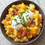 A delicious and hearty Cheesy Potato Egg Scramble featuring crispy potatoes, scrambled eggs, melted cheddar cheese, and optional ham or bacon. Perfect as a satisfying breakfast or brunch dish with a balance of protein, starch, and flavor.