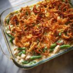 - Add Topping: Remove the casserole from the oven and carefully sprinkle the crispy fried onions on top to add a crunchy texture.
