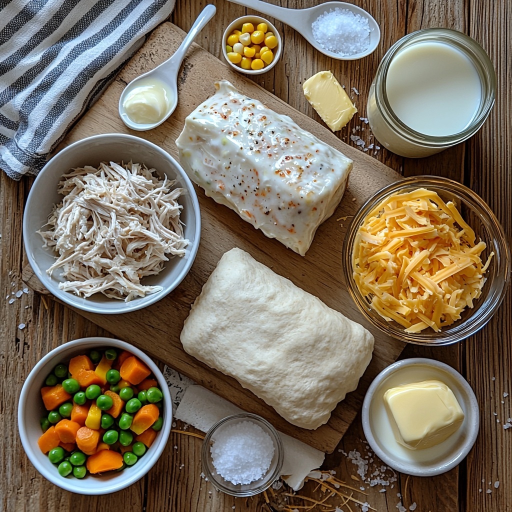 - Mix the Chicken Mixture: In a large bowl, combine the cooked chicken, cream of chicken soup, sour cream (or Greek yogurt), milk, frozen mixed vegetables, garlic powder, onion powder, salt, and pepper. Stir until all ingredients are well incorporated.