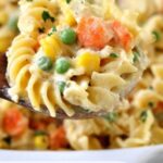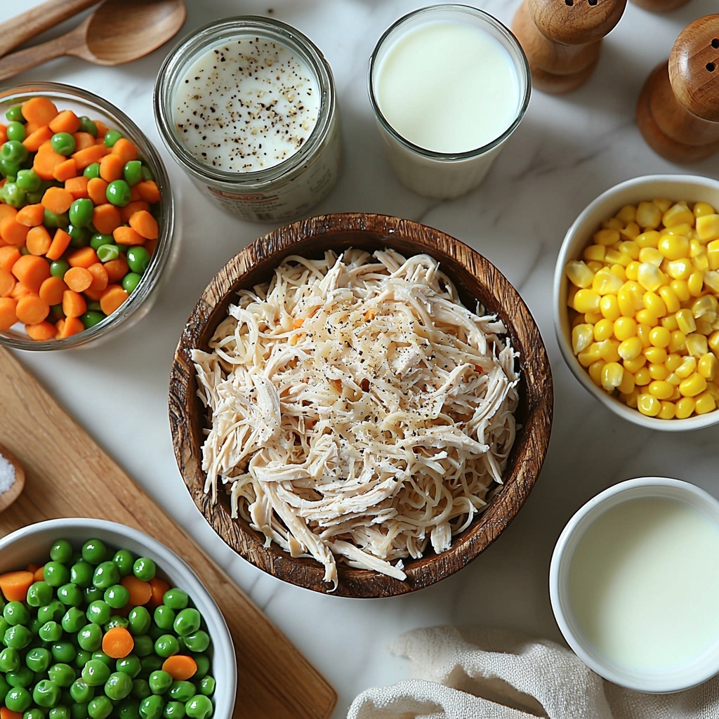 - Mix Ingredients: In a large bowl, combine the cooked shredded chicken, thawed peas and carrots, thawed corn, milk, cream of chicken soup, cream of mushroom soup, salt, pepper, dried minced onion, melted butter, garlic powder, and Italian seasoning. Stir the cooked noodles into this mixture gently to combine everything evenly without breaking the noodles.
