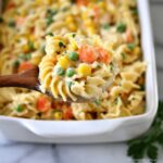 This comforting Chicken Noodle Casserole combines tender egg noodles, shredded chicken, and a medley of peas, carrots, and corn in a creamy, savory sauce made with cream of chicken and mushroom soups. Baked to perfection with a blend of herbs and spices, this easy-to-make casserole is perfect for a family-friendly dinner or potluck.