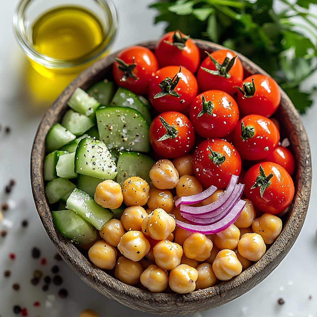 Start by gathering your chickpeas, cherry tomatoes, cucumber, red onion, and parsley into a large bowl. Mixing these fresh elements together early lets the flavors mingle, laying the perfect foundation for the salad.