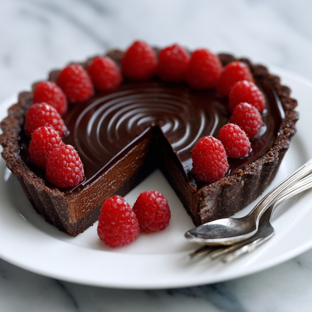 Before serving, arrange fresh raspberries beautifully around the edges or the center of the tart for a pop of color and fresh tang. To slice, warm your knife slightly for clean cuts through those layers, revealing the stunning contrast of textures and flavors inside.