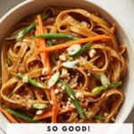Add the warm water gradually, stirring the dressing as you go. The goal is a velvety sauce that’s pourable but still thick enough to cling nicely to the noodles. You might need a little more or less water depending on your peanut butter’s consistency, so feel free to adjust accordingly.