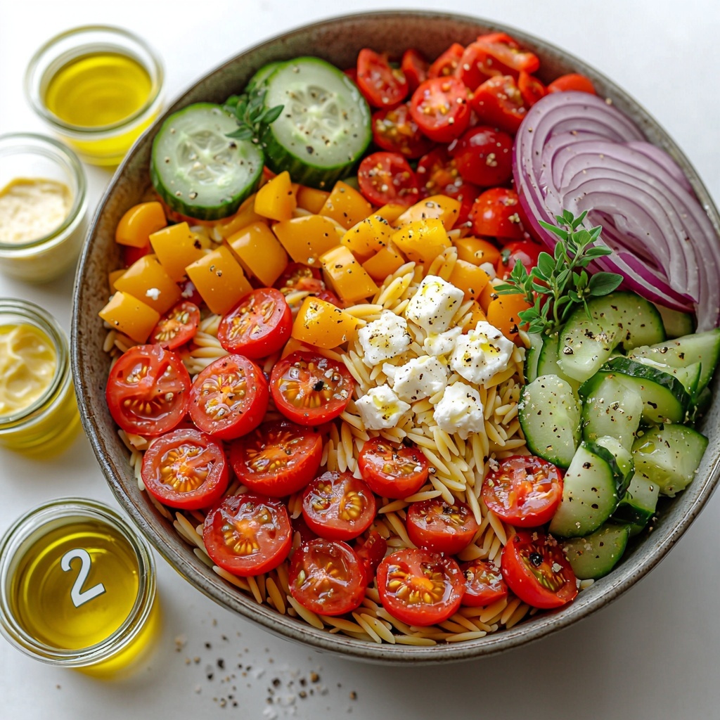- Combine Salad Base: In a large mixing bowl, combine the cooled orzo with the chopped vegetables, stirring gently to mix evenly and showcase the vibrant colors.
