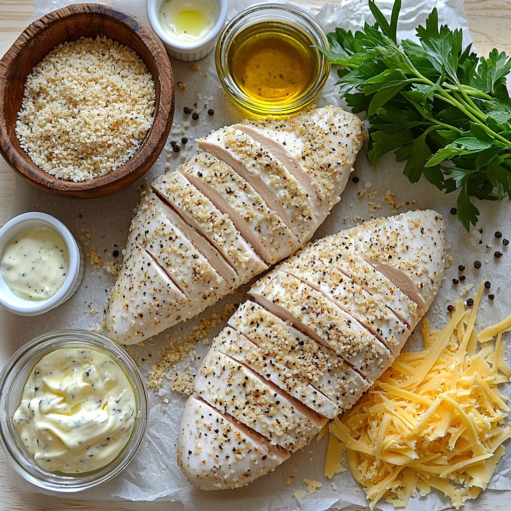 - Assemble Topping: Spread the cream cheese and ranch mixture over each seared chicken breast evenly. Sprinkle shredded provolone cheese on top, then cover with the toasted parmesan-panko mixture, pressing gently to adhere.