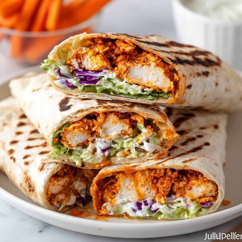 To assemble, lay out your large tortillas and layer in shredded lettuce, diced tomatoes, shredded cheese, and your buffalo-coated chicken strips. Drizzle with ranch or blue cheese dressing and roll them up tightly. Slice in half to make handling easier and to show off that colorful, delicious filling.
