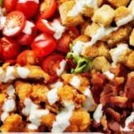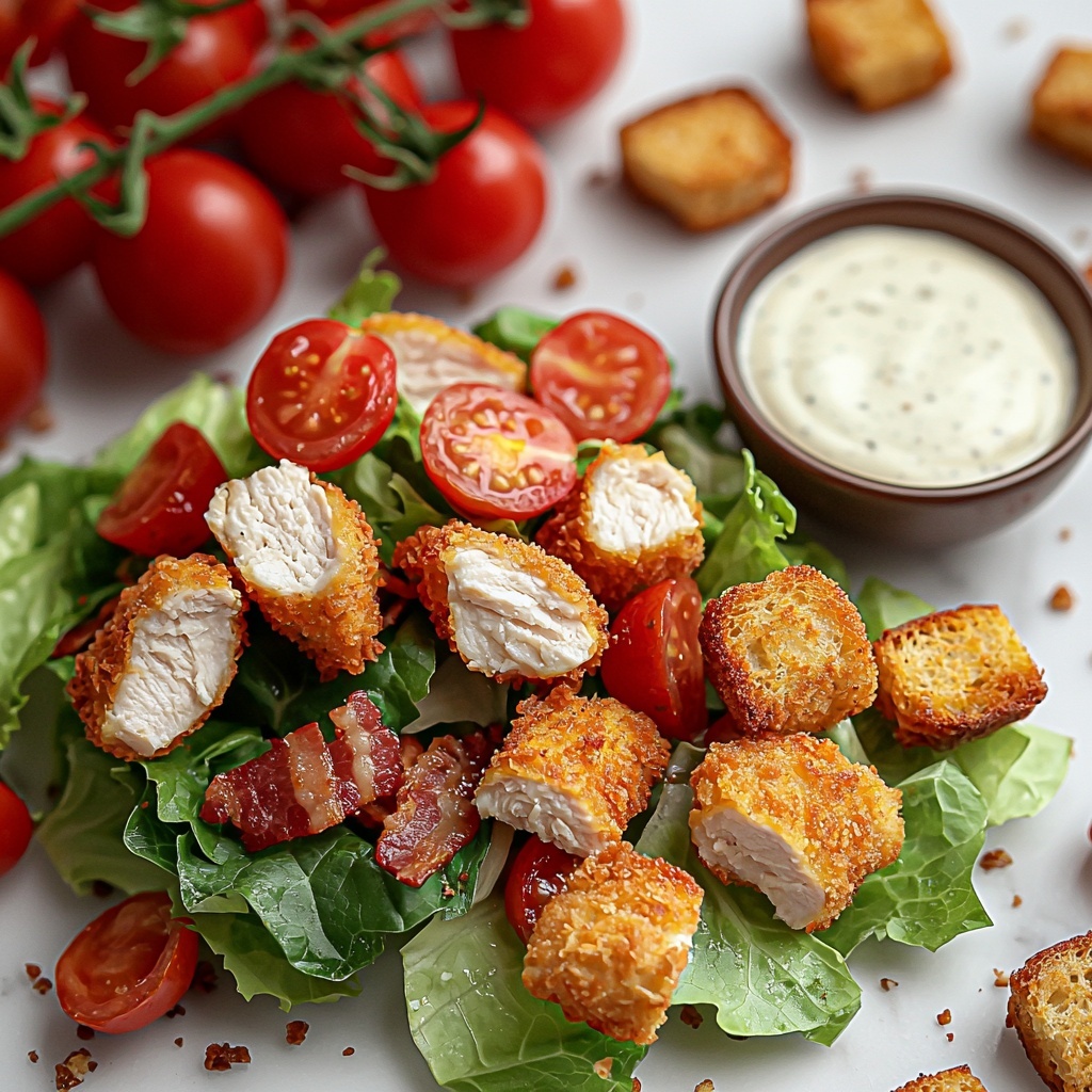 Crispy Chicken BLT Salad combines crispy breaded chicken tenders, smoky bacon, fresh cherry tomatoes, crunchy croutons, and crisp romaine lettuce. Topped with your favorite dressing, this salad offers a satisfying blend of textures and flavors perfect for a quick, hearty lunch or dinner.