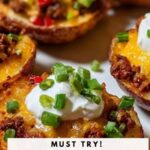 These Crispy Chili Loaded Potato Skins are the ultimate crowd-pleaser, combining perfectly baked russet potatoes with hearty chili, melted cheddar cheese, and fresh toppings. They are crispy on the outside, deliciously cheesy inside, and topped with creamy sour cream and vibrant green onions for a flavorful snack or appetizer that will dazzle your taste buds.