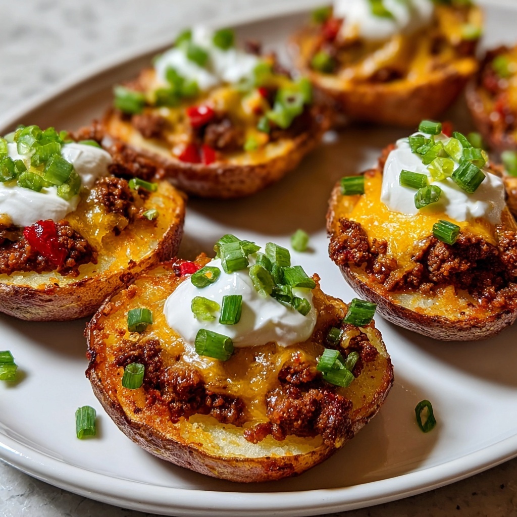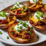 These Crispy Chili Loaded Potato Skins are the ultimate crowd-pleaser, combining perfectly baked russet potatoes with hearty chili, melted cheddar cheese, and fresh toppings. They are crispy on the outside, deliciously cheesy inside, and topped with creamy sour cream and vibrant green onions for a flavorful snack or appetizer that will dazzle your taste buds.