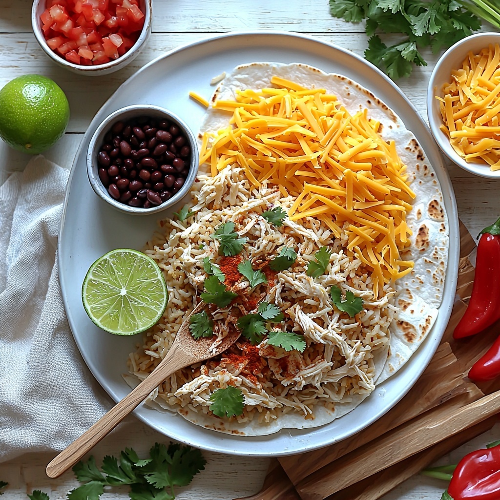 Lay out each flour tortilla and sprinkle 2 to 3 tablespoons of shredded cheddar cheese evenly in the center. Then spoon about half a cup of the chicken and veggie mixture right on top of the cheese. For an extra creamy touch, dot the filling with a little low fat sour cream—it’s optional but highly recommended to add that perfect tang and richness.