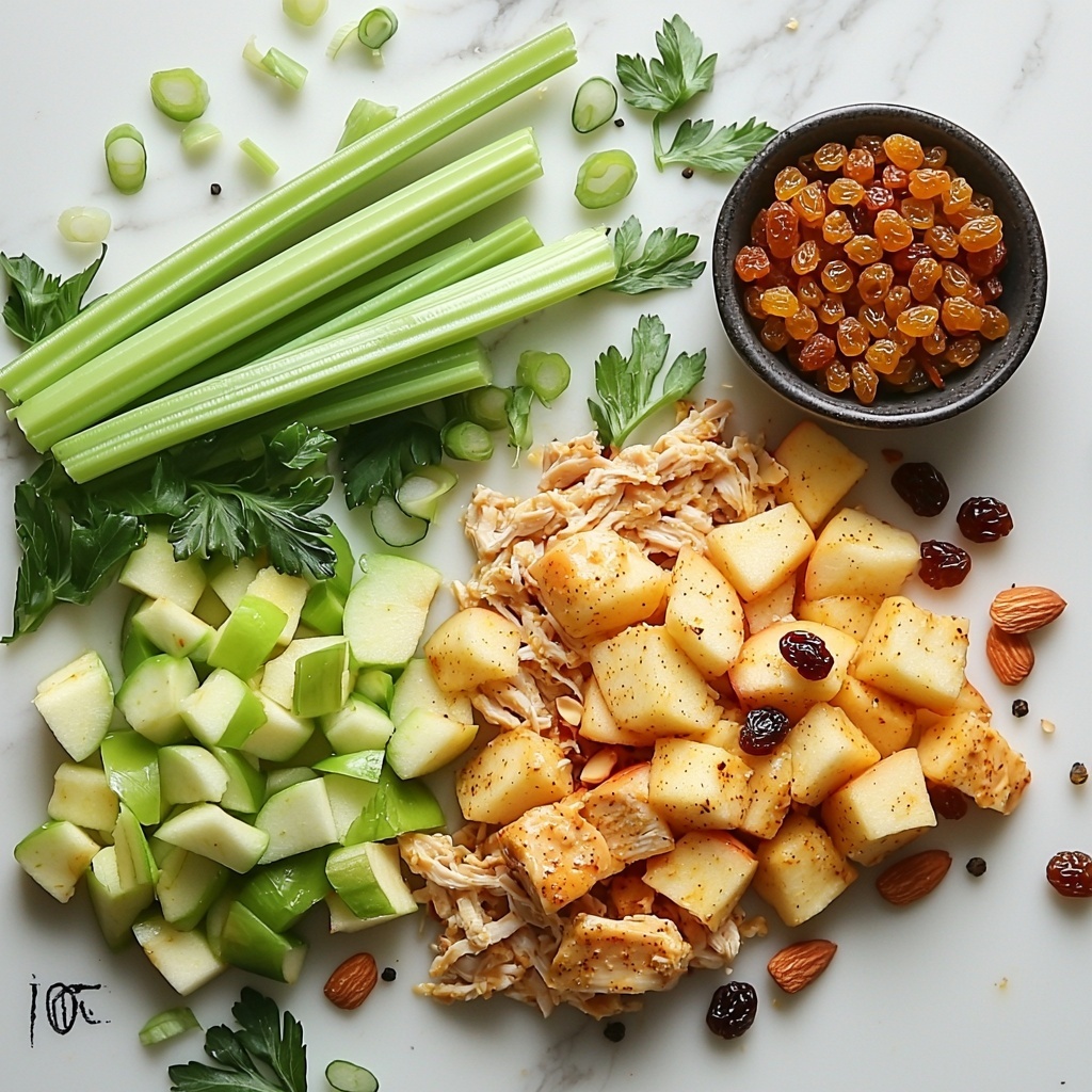 Next, gather your cooked chicken, chopped celery, sliced green onions, diced apple, golden raisins, and almond slivers into a large mixing bowl. This medley of ingredients gives you an exciting combination of textures and flavors even before adding the dressing.