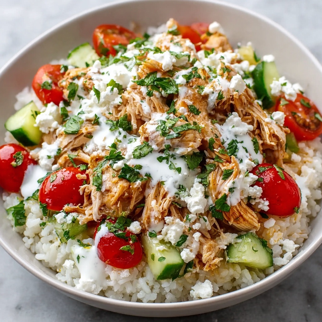 2. Combine Ingredients: In a large mixing bowl, mix together the shredded cooked chicken, tzatziki sauce, cooked rice, diced cucumbers, halved cherry tomatoes, and crumbled feta cheese until well combined.