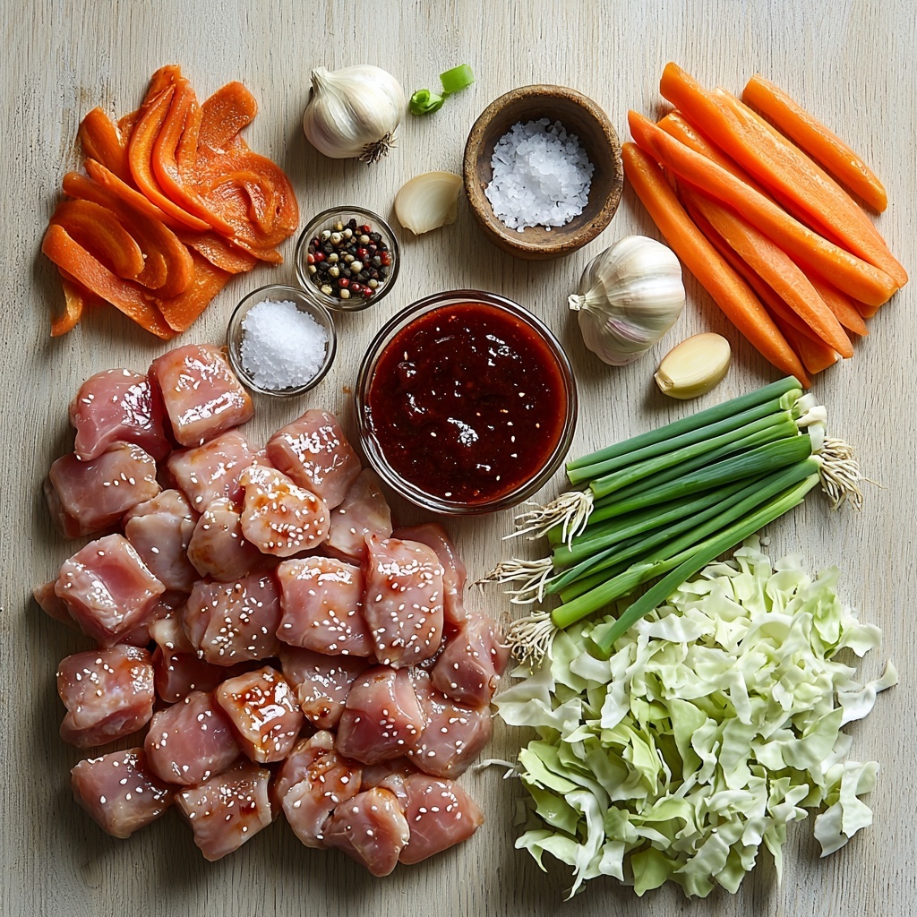 Heat a good splash of oil in a wok or large skillet over medium-high heat. Sear the marinated chicken pieces until they turn a gorgeous golden brown, then remove them from the pan to keep warm. Next, sauté the onions, garlic, and carrots until they become fragrant and slightly softened. Add the cabbage next, stir-frying until it’s just tender but still has that satisfying crunch. Return the chicken to the pan and drizzle in the light soy sauce, tossing everything together to fully coat each component. Finish with a sprinkle of scallions for that fresh contrast and serve immediately.
