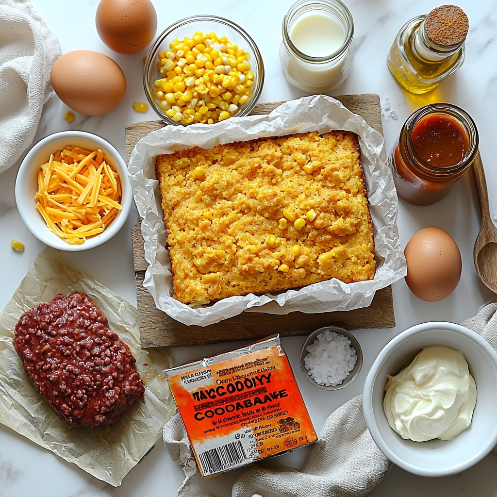 The ingredients for this recipe are delightfully straightforward but pack a flavorful punch, each contributing to the richness, texture, and heartwarming taste of the casserole. From the slightly spicy taco-seasoned beef to the golden cornbread topping, every component plays an essential role in making this dish shine.