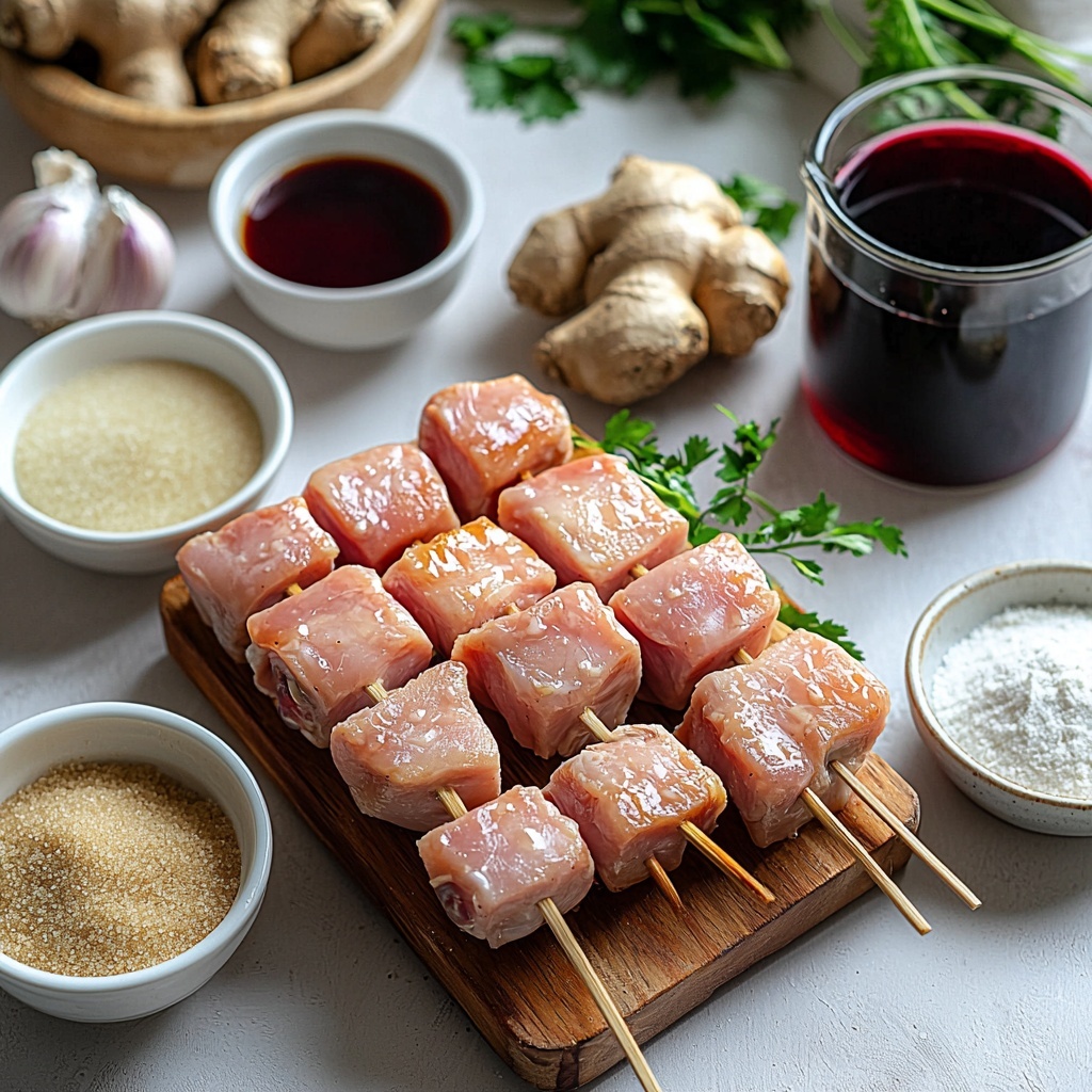 4. Marinate Chicken: Combine the chicken chunks with minced garlic, grated ginger, and 1/4 cup of the prepared yakitori sauce. Marinate for at least 10 minutes to infuse flavors.