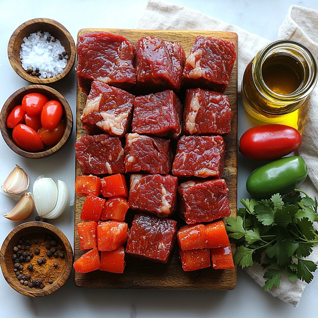 - Prepare Ingredients: Chop the onions, garlic, tomatoes, and bell peppers, and cut the beef chuck into 1-inch cubes to have all ingredients ready for cooking.