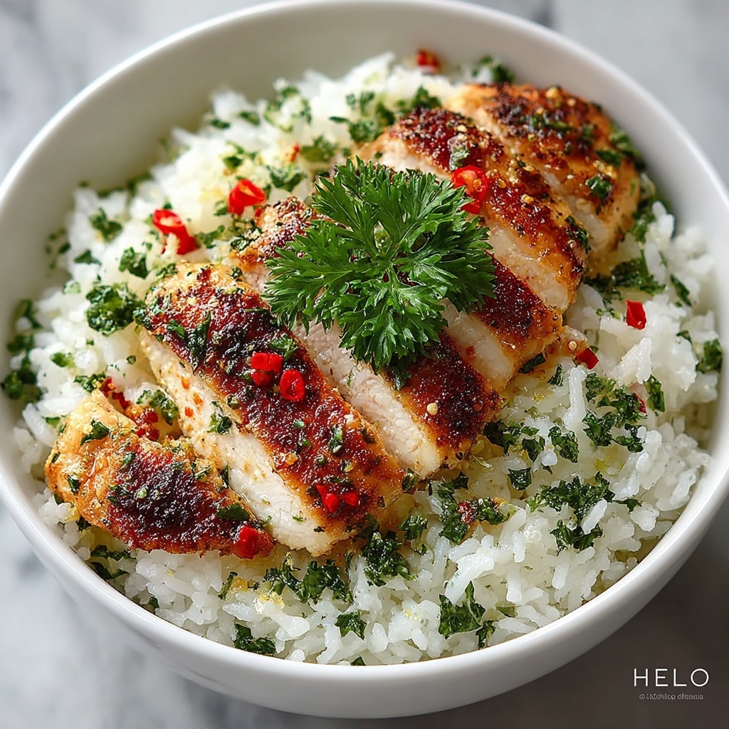 A flavorful Garlic Butter Rice with perfectly grilled chicken breasts, combining tender rice infused with garlic, butter, and fresh parsley alongside juicy, seasoned grilled chicken. This dish is quick to prepare and ideal for a satisfying weeknight dinner.