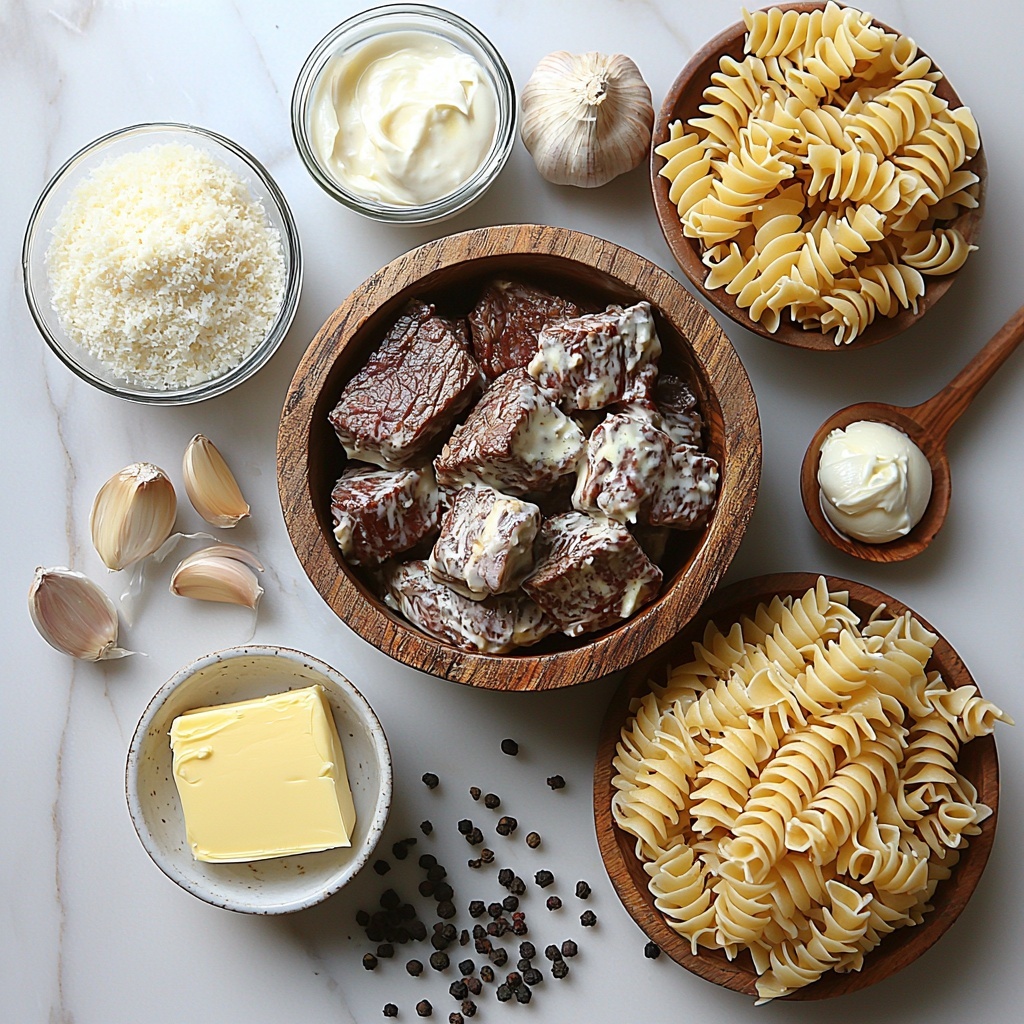 With just a handful of straightforward ingredients, each plays a vital role in crafting the perfect balance of taste and texture in this Garlic Butter Steak Bites & Cheesy Alfredo Twists Recipe. From the robust steak to the creamy Parmesan and melty mozzarella, every element brings something special to the table.