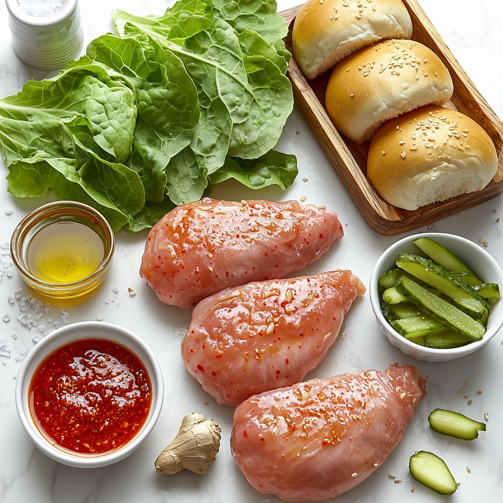 Start by creating the marinade, which forms the flavor backbone of this Gochujang Chicken Sandwich Recipe. In a bowl, combine the gochujang paste, mayonnaise, honey, minced garlic, grated ginger, salt, and pepper. Mix until smooth and well combined. Coat the chicken breasts thoroughly with this mixture, making sure every inch is covered. Then, pop the chicken into the refrigerator and let it marinate for at least 30 minutes—this step is key to infusing those bold flavors deeply into the meat.