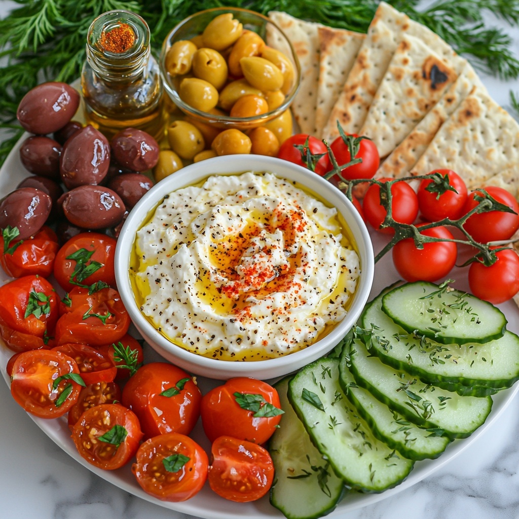 Spread the whipped feta into a serving bowl or plate and drizzle a little olive oil over the top for shine and extra richness. Arrange warm pita wedges, cherry tomatoes, cucumber slices, Kalamata olives, roasted red peppers, and marinated artichoke hearts artistically around the whipped feta. This colorful arrangement invites everyone to dig in and share the Mediterranean love.