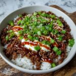 This Ground Beef Hot Honey Bowl combines savory seasoned ground beef with creamy whipped ricotta, fluffy white rice, and a sweet-spicy drizzle of hot honey. Enhanced with soy sauce, garlic, and brown sugar, this dish offers a delightful balance of flavors and textures, perfect for a weeknight meal that’s both comforting and unique.