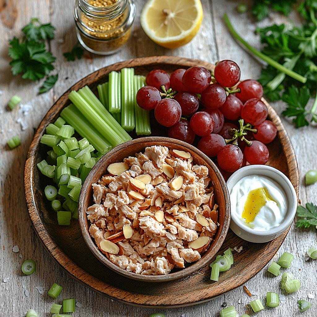 Start by placing the chopped or shredded chicken, diced celery, halved red grapes, sliced almonds, green onions, and finely chopped parsley in a large bowl. Gently mix them together until everything is evenly distributed. This blend of textures and colors is what makes the salad so inviting at first glance.