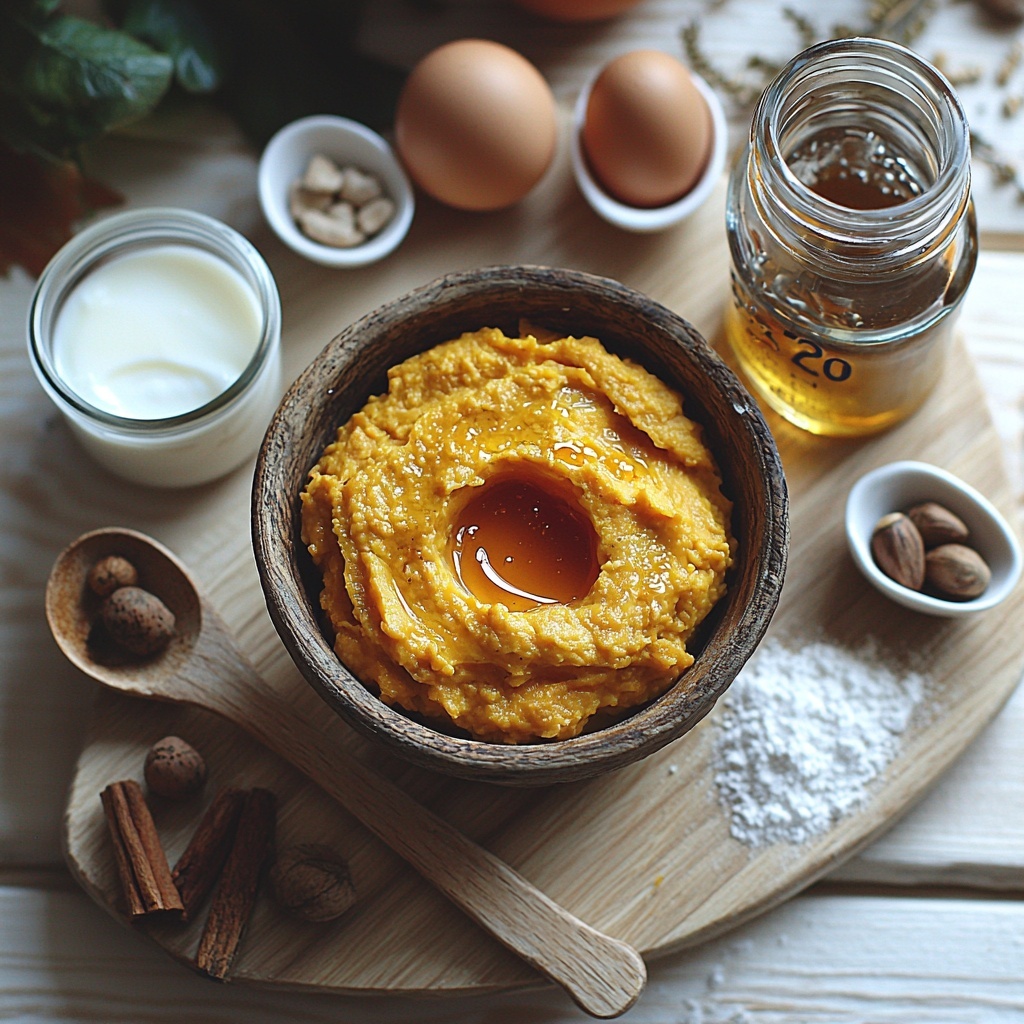 - Combine wet ingredients. In a large bowl, mix together the canned pumpkin, Greek yogurt, eggs, honey, and vanilla extract until the mixture is smooth and well combined.