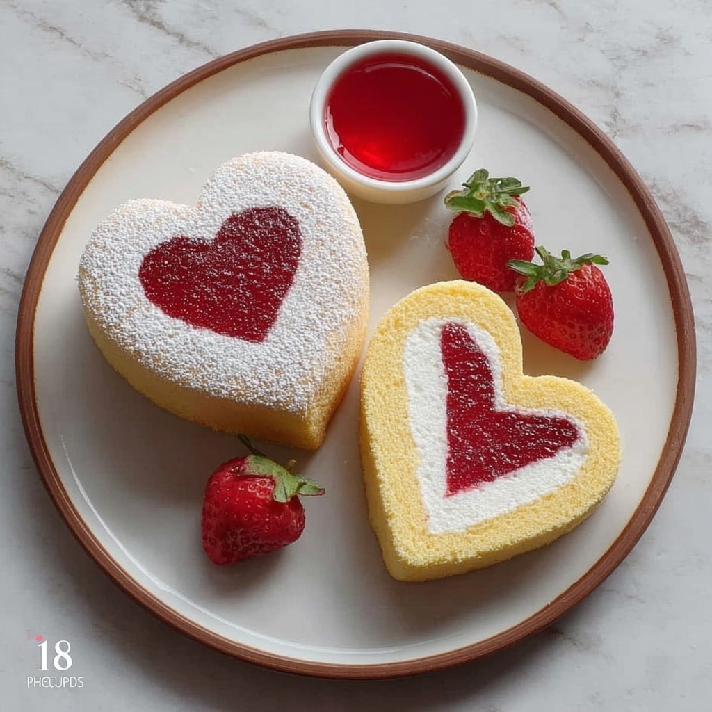 This delightful Heart-Shaped Swiss Roll features a tender, fluffy red sponge cake filled with luscious whipped cream and strawberry jam. Rolled into a classic Swiss roll and then cleverly formed into a heart shape, it’s a perfect romantic dessert or festive treat. Fresh strawberries and a dusting of powdered sugar add a fresh, sweet finish to this visually stunning and delicious cake.