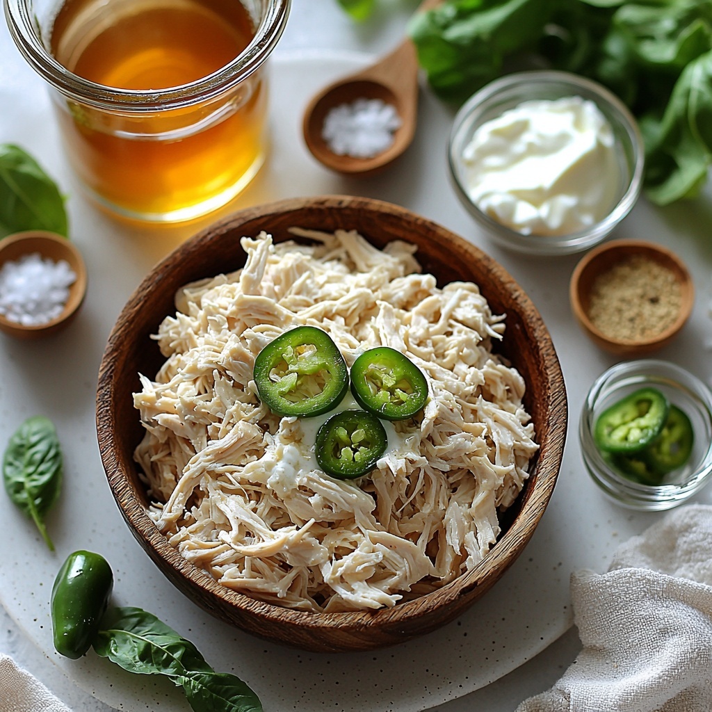 This recipe calls for straightforward, essential ingredients that work harmoniously to create that irresistible creamy and spicy sauce. Each component plays a vital role, from the savory shredded chicken providing hearty protein, to the cream and cream cheese that build a velvety texture, and the jalapenos that inject the perfect amount of zing and color.