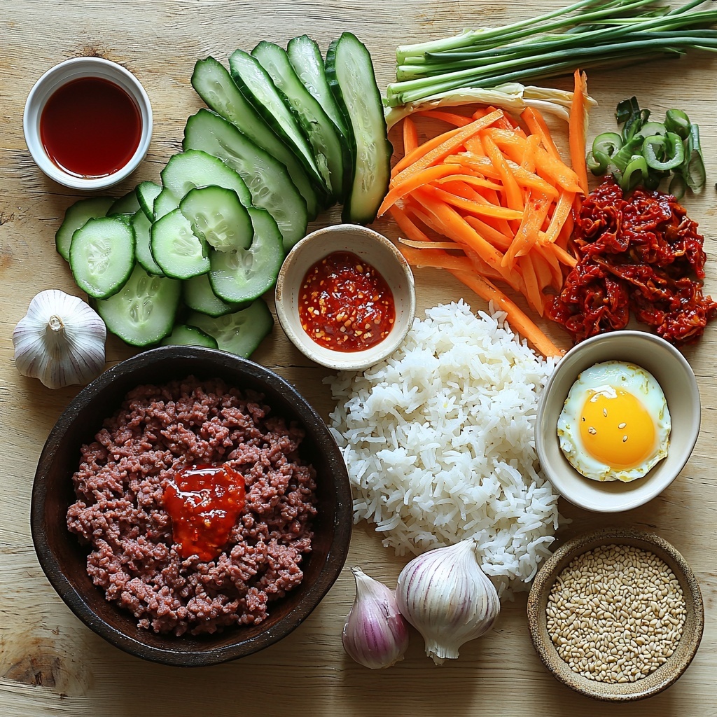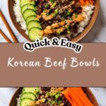 - Assemble the bowls: Divide the cooked rice into bowls. Spoon the Korean beef mixture evenly over the rice. Top each bowl with sliced cucumbers, shredded or julienned carrots, and sliced green onions. Add optional toppings such as kimchi, sesame seeds, or a fried egg if desired.
