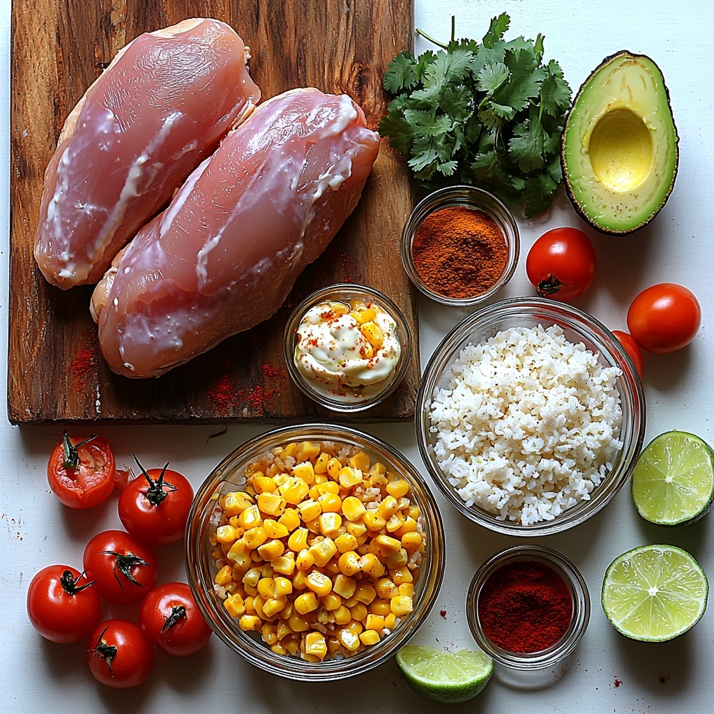 While the chicken cooks, mix together the corn with mayonnaise or Greek yogurt, lime juice, chili powder, and an optional pinch of cayenne pepper if you want that extra heat punch. This creamy dressing transforms the corn into a tangy, spicy, and luscious topping that’s key to the Loaded Street Corn Chicken Rice Bowl Recipe experience.