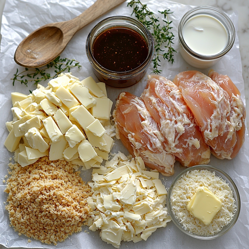Simple yet essential, the ingredients for this recipe come together to build layers of flavor, texture, and richness. Each component plays its part—from the marinade that tenderizes the chicken to the crispy breadcrumb topping that adds that heavenly crunch.