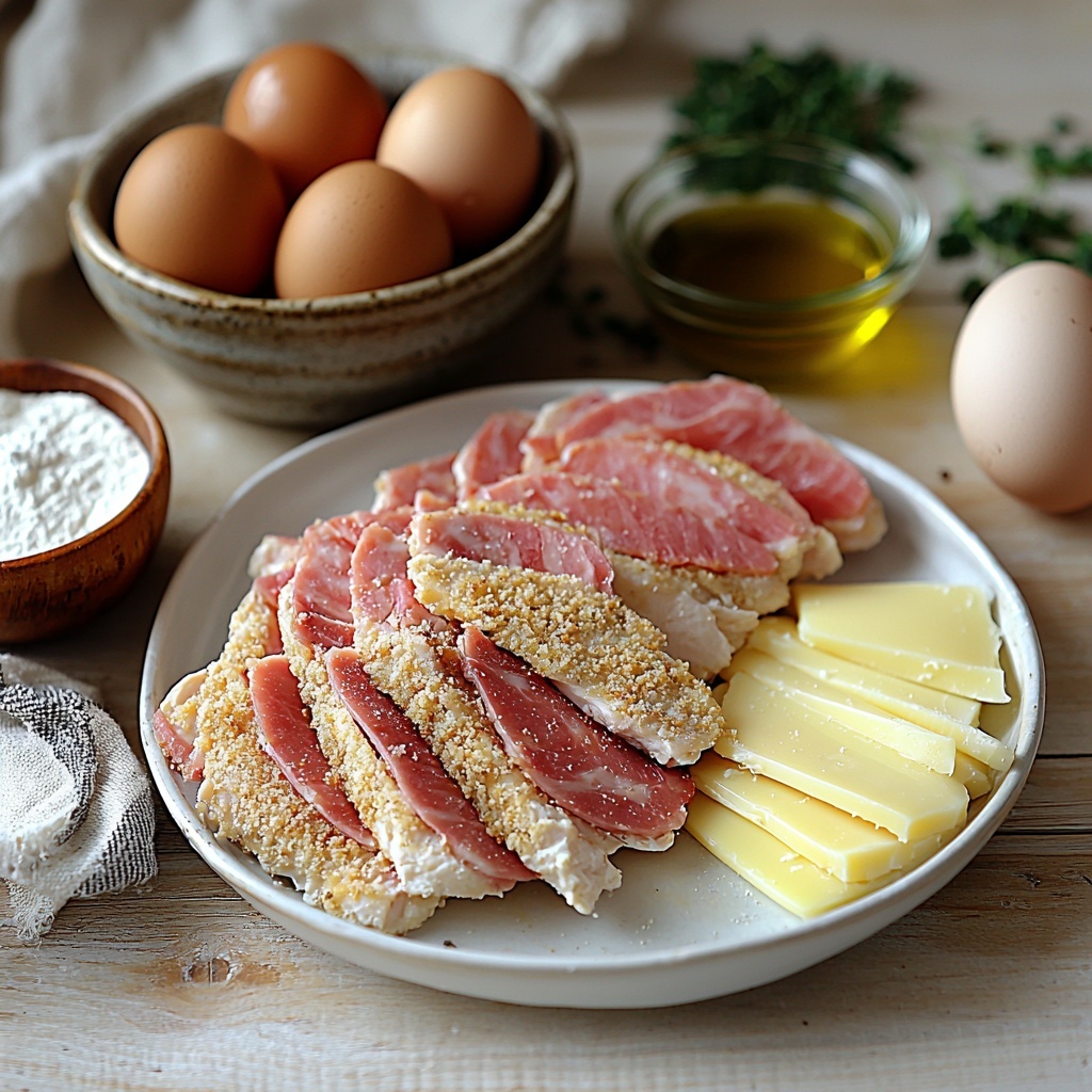 6. Assemble and Bake: Place the fried chicken breasts on a baking sheet. Top each with a slice of cooked chicken ham and 1-2 slices of Swiss cheese.
