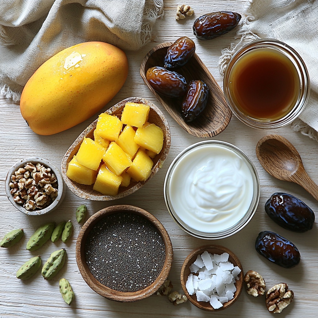 Each ingredient in this Mango Lassi Chia Pudding with Sticky Walnut Crumble Recipe has been carefully selected for its role in creating a balance of creamy, fruity, and crunchy sensations. These essentials are simple but make all the difference in taste, texture, and color, bringing the dish to life in the most delightful way.