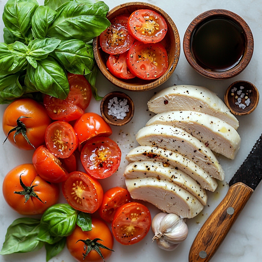 Start by preheating your oven to 400°F to get it ready for baking. While it warms up, thinly slice your Roma tomatoes and roughly chop the basil leaves. Toss these together in a bowl with 2 teaspoons of balsamic vinegar, 2 tablespoons of olive oil, 1 teaspoon of Italian seasoning, one minced garlic clove, and a pinch of sea salt and freshly ground pepper. This vibrant mixture will infuse your chicken with fresh, tangy, and herbaceous flavors.