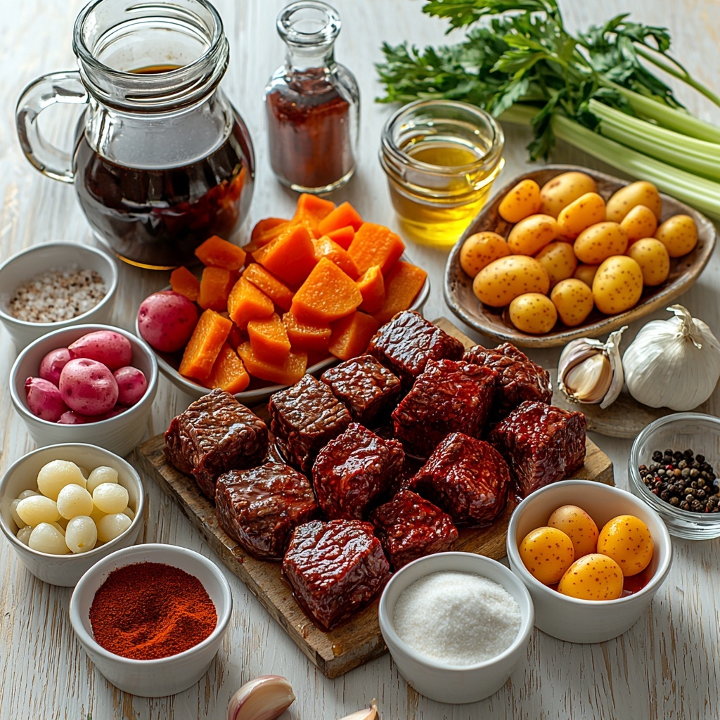 - 2 pounds beef stew meat (cubed chuck roast): Provides tender, flavorful beef that becomes melt-in-your-mouth soft after slow simmering.