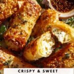 Oven Fried Feta Rolls with Chili Honey are crispy, golden phyllo pastry rolls filled with a creamy blend of feta and ricotta cheeses, seasoned with oregano and garlic. Baked to perfection and drizzled with a spicy-sweet chili honey sauce, these savory rolls offer a delightful combination of textures and flavors, perfect as an appetizer or snack.