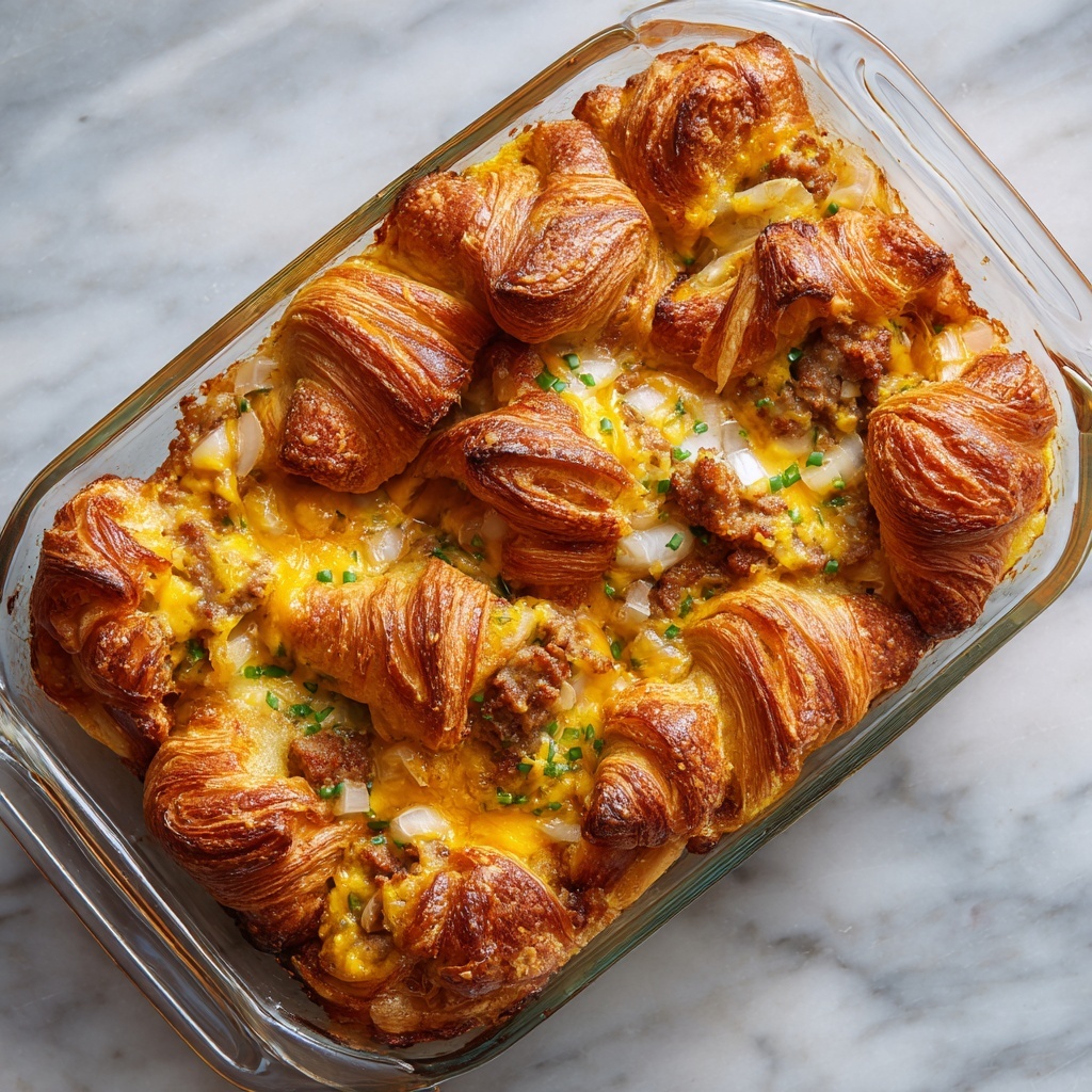 This Overnight Croissant Breakfast Casserole is a delicious and convenient make-ahead dish featuring buttery croissants, savory breakfast sausage, sautéed onions, and melted cheddar cheese all baked to golden perfection. Prepared the night before and baked in the morning, it pairs wonderfully with a creamy homemade sausage gravy, making it perfect for a hearty weekend brunch or holiday breakfast gathering.