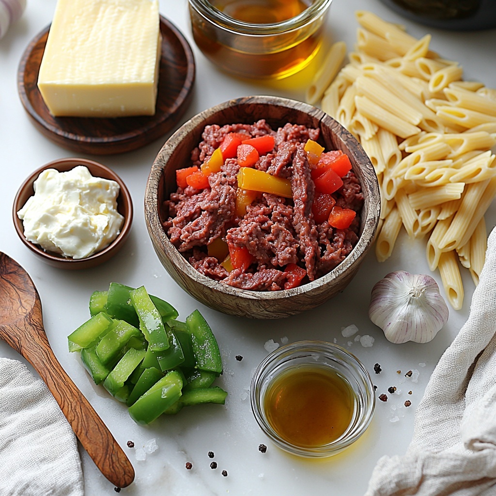 The beauty of this Philly Cheesesteak Pasta Recipe lies in its simple, straightforward ingredients, each playing a crucial role in building layers of flavor, texture, and color. From the tender meat and fresh veggies to the creamy cheeses and hearty pasta, every item is essential for that authentic, rich taste.