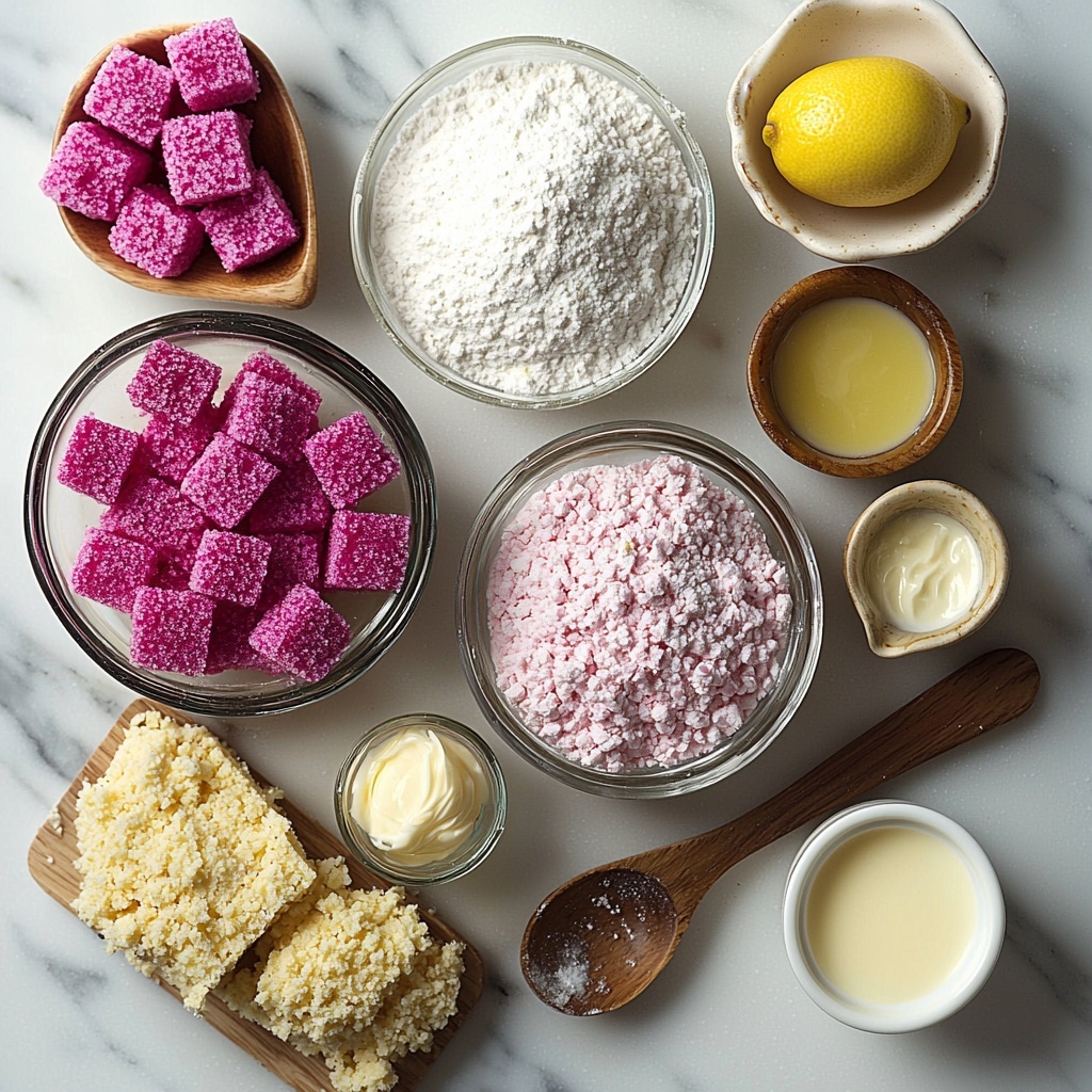 This Pink Lemonade Cookies Recipe uses simple, classic ingredients that you probably already have on hand, with a few vibrant extras to boost flavor and color. Each element plays a crucial role—from the softened butter that ensures tender richness, to the lemon extract that infuses every bite with citrusy brightness, and the pink food coloring that gives these cookies their signature look.