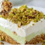 This Pistachio Pudding Dessert is a creamy, layered delight featuring a crunchy graham cracker and pistachio crust, a smooth cream cheese layer, rich pistachio pudding, and topped with fluffy whipped topping and chopped pistachios. Refrigerated overnight, it’s a perfect make-ahead no-bake treat for gatherings or a sweet indulgence at home.