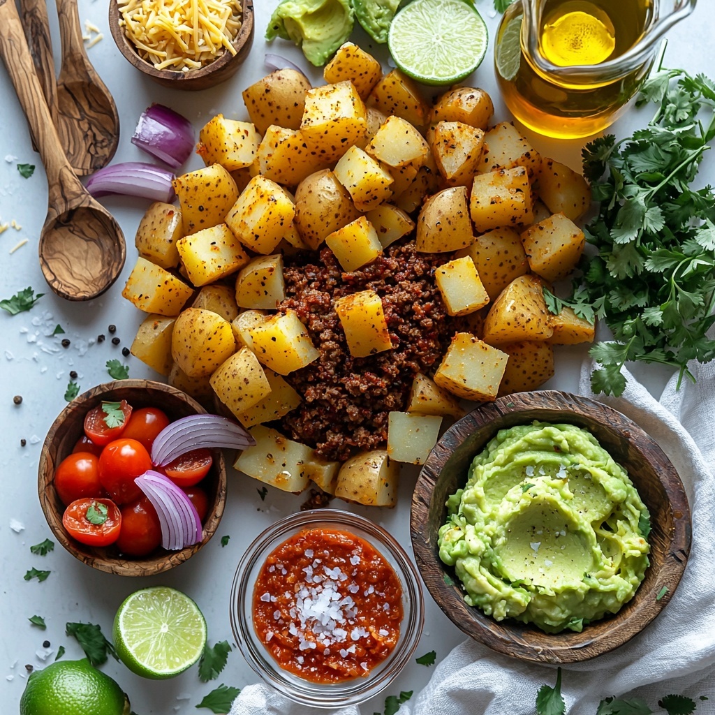 Divide the crispy roasted potatoes evenly among four bowls. Top each with a generous scoop of the spiced beef mixture, then sprinkle liberally with the grated Mexican cheese blend so it melts into the warm beef and potatoes. Add dollops of the creamy guacamole and fresh salsa for color, texture, and flavor contrast. Serve with optional lime wedges on the side to squeeze over the top, adding a final zing that ties all the flavors together beautifully.